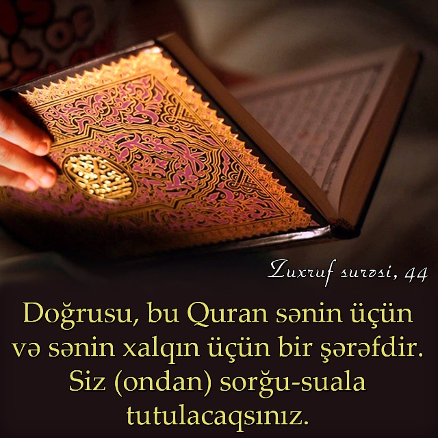Odur ki, sən özünə vəhy olunan (ayələrə) sarıl! Əslində, sən düz yoldasan. Doğrusu, bu (Quran) sənin üçün və sənin xalqın üçün bir şərəfdir. Siz sorğu-suala tutulacaqsınız. (Zuxruf surəsi, 43-44)